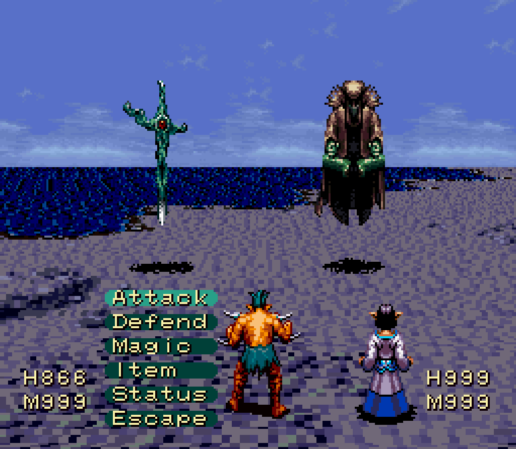 I picked the demon Leje, whose ancestry puts him at odds with a lot of the characters. Soon I already had strong impressions of the others: the strange robot Lux, the asshole white mage Valsu (who hated me for being a demon), the standoffish elf Esuna... These small interactions end up giving the 7th Saga a lot of flavor, and you really enjoy going into new towns and just seeing who's up and about. Even though most of the time getting your ass kicked by a fellow apprentice usually entails restarting from a previous save (there's no way you're getting your runes back), that whole process feeds into your (negative) opinion of them, and they slowly become an enemy larger than the game itself.
